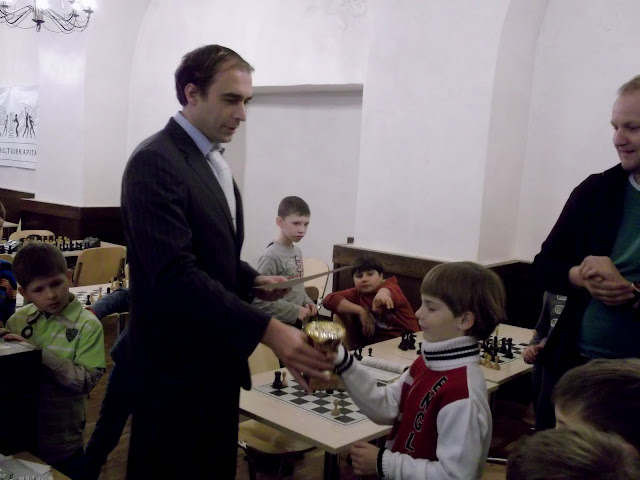 Гроссмейстер Кайдо Кюлаотс вручает кубок Андрею Мясцову.